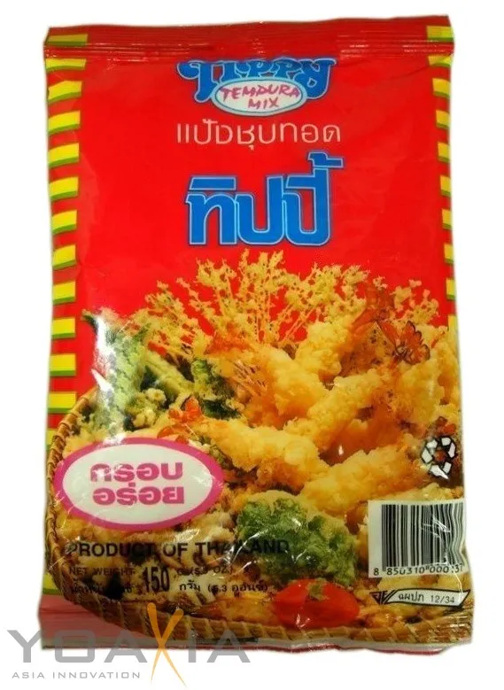 12 x 150g = 1.800gTIPPY Tempura Mix Tempura Panade zum FrittierenBackmischung für Tempuragerichte Eine Packung reicht für 500g Fleisch, Fisch, Garnelen, Geflügel oder Gemüse. Zubereitungshinweis:Den Inhalt der Packung mit 200 ml Wasser gut verrühren, bis ein gleichmäßiger Teig entsteht. Zu Frittierendes vollständig mit dem Teig umhüllen. In heißem Fett frittieren, bis es goldbraun ist. Nach dem Frittieren auf Küchenpapier abtropfen lassen. Zutaten: Weizenmehl 70%, Maisstärke 15%, Reismehl 5%, Backtriebmittel: E450, E500; Zucker, Salz, Geschmacksverstärker: Mononatrium Glutamat (E621), Verdickungsmittel E412. Inhalt: je 150g x 12 = 1.800g Mindestens Haltbar bis: 17. 11. 2025 Herkunft: Thailand Hersteller: United Flour Mill Public Co., LTD., 51 Poochaosamingprai Rd., Samutprakarn, Thailand Importeur: Heuschen & Schrouff OFT B.V., P.O. Box 30202, 6370KE Landgraaf – Holland Versandgewicht: 2.280g Durchschnittliche Nährwertangaben pro 100g Average Nutritional Values per 100g Brennwert / Energy 340 kJ / 80 kcal Fett / Fat <0,5g davon gesättigte Fettsäuren / of which saturates <0,1g Kohlenhydrate / Carbohydrates 18,0g davon Zucker / of which sugar <0,5g Eiweiß / Protein 2,0g Salz / Salt <0,01g