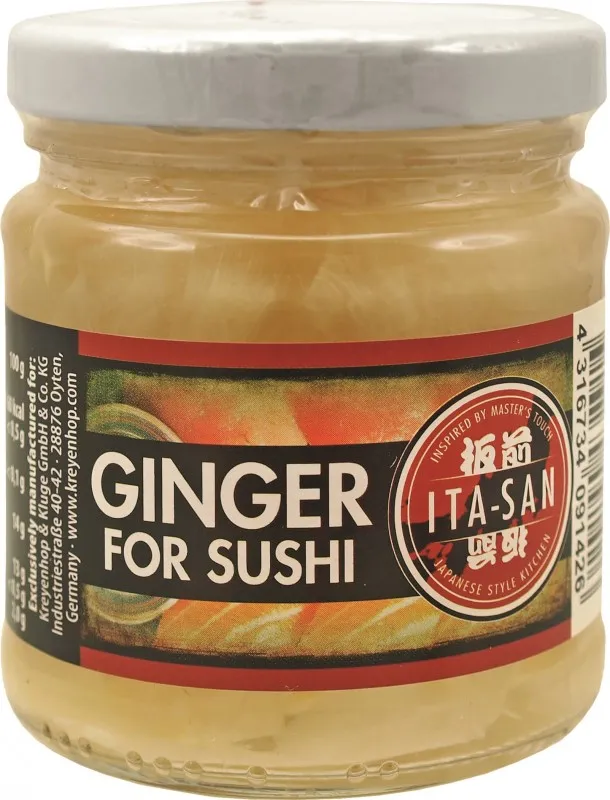 Eingelegter Ingwer für Sushi Eingelegte Ingwerscheiben190g / 110g AbtropfgewichtSushi Ginger Eingelegter Ingwer für Sushi, weiß, mit Zucker und Süßungsmittel. Zutaten: Ingwer, Wasser, Zucker, Essig, Salz, Säuerungsmittel: Essigsäure, Citronensäure, Antioxidationsmittel: Ascorbinsäure; Süßungsmittel: Aspartam (enthält eine Phenylalaninquelle). Inhalt: 190g / Abtropfgewicht (ATG): 110g Mindestens Haltbar bis: 17. 02. 2027 Herkunft: China Importeur / Exclusively manufactured for: Kreyenhop & Kluge GmbH & Co. KG Lebensmittelimport, Industriestr. 40-42, 28876 Oyten Versandgewicht: 430g Durchschnittliche Nährwertangaben pro 100g Average Nutritional Values per 100g Brennwert / Energy 254 kJ / 60 kcal Fett / Fat <0,5g davon gesättigte Fettsäuren / of which saturates <0,1g Kohlenhydrate / Carbohydrates 14g davon Zucker / of which sugar 13g Eiweiß / Protein <0,5g Salz / Salt 2g