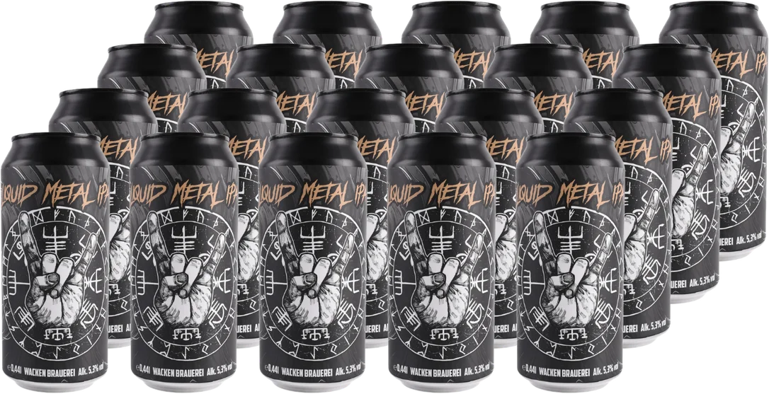 Alle Informationen zu 24x Liquid Metal IPA in der Dose Unser knackiges Liquid Metal IPA ist Hardrock pur. Gestopft mit den amerikanischen Aromahopfen Simcoe, Summit und Crystal spielt es gewaltige frisch-fruchtige Riffs auf Zunge und Gaumen. Der ausgewogene Körper und die markante Bittere rocken diese Fruchtbombe mit gut 5 Umdrehungen die Kehle hinab.Genieße es kühl, laut und lächelnd. Denn denk dran, was Lemmy sagte: „Eat, drink and be merry, for tomorrow we die.”