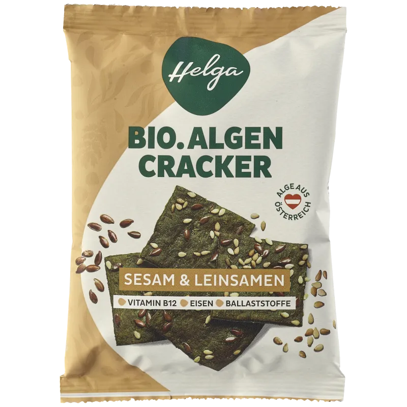HELGA BIO Algencracker sind knusprig, grün und perfekt als leichter nährstoffreicher Snack. Dafür sorgen das Superfood Chlorella Mikroalge, Dinkelmehl und Leinsamen. Die Chlorella Süßwasser Mikroalge verleiht den Crackern ihren unverwechselbar guten Geschmack und bereichert sie mit wertvollem Vitamin B12 und Eisen.
