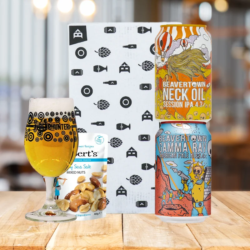 This gift set features two 330ml cans of Beavertown’s Fan Favourites, perfect for experiencing the highly acclaimed brewery. Along with a stylish Beerhunter Glass and a gourmet snack, elevate your beer enjoyment. Optional gift message available.