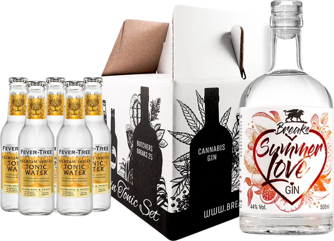 Alle Informationen zu Breaks Genießer-Set Summer Love Dieses Gin Tonic Set ist immer eine gute Wahl. Egal ob als Geburtstagsgeschenk, als Gastgeschenk oder einfach nur mal so – dieses Set weckt Freude bei jedem Gin Liebhaber.Das ist im Paket enthalten:1x Breaks Summer Love Gin | 0,5 l – 44 % vol.Der fruchtig-frische Sommergenuss ist da.Unser Summerlove Gin ist eine wahre Fruchtexplosion: Edle Botanicals kombiniert mit süßen Himbeeren, saftiger Mango, exotischer Papaya, erfrischender Maracuja, spritziger Ananas und fruchtiger Melone.Lead Botanicals: Mango, Papaya, Maracuja, Ananas5x Fever Tree Indian Tonic Water | 0,2 lErlesene Pflanzenextrakte mit hochwertigem Chinin von den “Fever-Trees” aus der demokratischen Republik Kongo verbinden sich zu einem köstlichen, preisgekrönten Tonic mit einem einzigartig reinen und erfrischenden Geschmack und Aroma. Der hohe feinperlige Kohlensäuregehalt sorgt für eine lang anhaltende Frische.Zutaten:Wasser, Zucker, Kohlensäure, Säuerungsmittel (Citronensäure), natürliche Aromen, Aroma: ChininNährwerte pro 100 ml: Brennwert: 126 kJ/ 30 kcal | Fett: 0 g | davon gesättigte Fettsäuren: 0 g | Kohlenhydrate: 7,4 g | davon Zucker: 7,4 g | Eiweiß: 0 g | Salz: 0 g