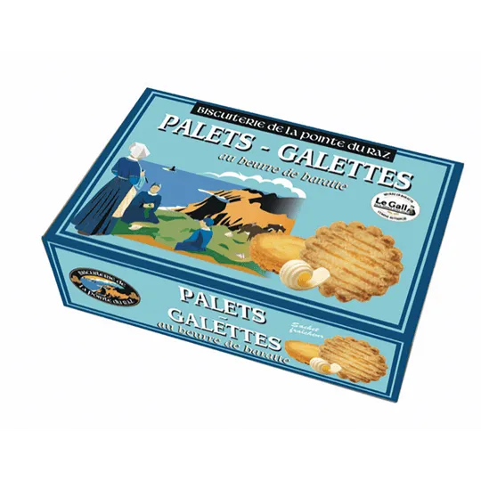 Seit 1936 gibt es die Keksbäckerei an der Pointe du Raz, die sich vor allem mit ihrem süßen bretonischen Gebäck wie Palets und Galettes einen Namen gemacht hat. Die Produkte werden bis heute mit traditioneller Fassbutter hergestellt. Die Box enthält fünf Packungen mit jeweils sechs Galettes und vier Packungen mit jeweils zwei Palets, die auch unter dem Namen Traou-Mad bekannt sind (Bretonisch für »gute Dinge«). Sie schmecken nicht nur lecker mit einer authentischen Schale Cidre, sondern auch zu Tee und Kaffee.