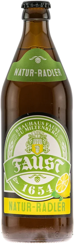 More information about Brewery Faust Natur-Radler small The sun shines warmly from a cloudless sky, the forest smells fresh and the gravel crunches under the tires of the bike. A wonderful summer’s day on the bike is coming to an end and only one thing can make this day even more perfect: A cold Radler!The Natur-Radler from Faust flows into the glass in a cloudy golden hue and forms a mixed-pored, white foam. The unfiltered mixed beer drink exudes a fresh, lemony aroma. A gentle hint of hops joins in and whets the appetite for the first sip. The refreshing character of the natural Radler is revealed here: zesty lime and juicy lemon form a stage for malt and hops, which support the dominant fruitiness with elegant undertones. A sweet malt note accompanies the drinking pleasure and gives way to a wonderfully bitter hop bitterness towards the end. In contrast to conventional Radlers, the Natur-Radler has much more character. The unfiltered beer gives the mixed drink that certain something and also gives beer fans their money’s worth. Fausts Natur-Radler is the perfect blend of fruity refreshment and tart beer. Faust’s summery composition is completely free from artificial sweeteners and gets its infinitely fresh effervescence from real lemon juice. We recommend Natur-Radler to anyone who likes a mixed drink and is looking for the ultimate refreshment on hot summer days. Although the Natur-Radler also tastes good in the depths of winter. After all, lemon always works, doesn’t it?