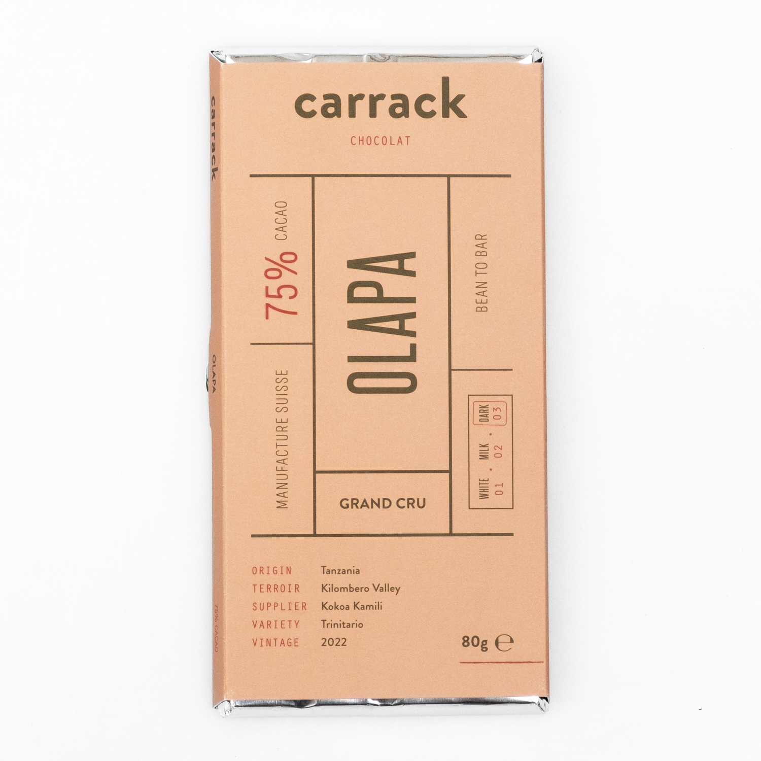 Crafted from ethically sourced Tanzanian cocoa, this premium chocolate offers a truly heavenly taste experience. Inspired by Olapa, the moon goddess of Maasai mythology, it delights with subtle notes of redcurrant, caramel and gianduja.