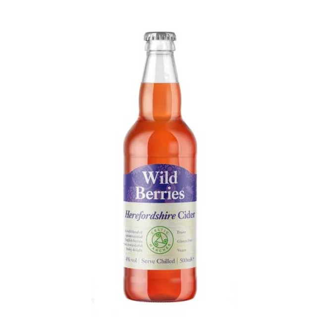 Celtic Marches Wild Berries 4% Cider ist ein mittelkräftiger Craft Cider, der vor dem typischen Geschmack der Heckenlandschaft Herefordshires nur so strotzt. Eine reichhaltige Mischung aus wilden Beeren verleiht ihm seinen tief rubinroten Farbton. In der Nase zeigt sich eine feine Erdbeernote, die in ein wunderbares Finish mit den aromatischen Nachklängen von Brombeeren übergeht.