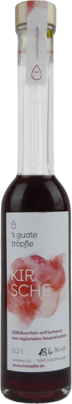 More information about Cherry Sweet, tart and refreshing from regional sour cherriesWe use regional sour cherries for our cherry liqueur, which do justice to the depth of flavor and the experience of this great fruit. This provides a great volume of flavors without the addition of artificial flavorings.Whether pure, in sparkling wine or with desserts. Our cherries are always a delight.Additional product information about our cherry liqueurSales : Cherry liqueurAlcohol content: 16.6 % vol (the stated alcohol content may vary depending on the batch)Filling quantity: 200 ml