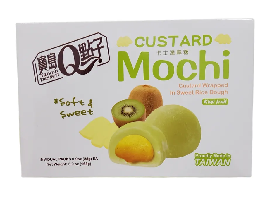 Zutaten: Maltose, Klebereis, Wasser, Zucker, Verdickungsmittel E1442, Basiscreme(Sojaöl, Süßstoff E420, Zucker, Wasser, Reisstärke, Verdickungsmittel E 406, E407, Magermilchpulver, Milchprotein, Aroma, Eiweißpulver, Volleipulver, Farbstoff E160a, Kiwipulver, Trehalose, weiße Schokolade, Palmöl, Aroma, Salz, Farbstoffe E133 E 102, Emulgator E471, Konservierungsmittel E202, Kartoffelstärke