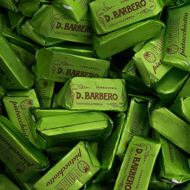 Entdecke cremiges Pistazien Nougat: Pistacchiotti von D.Barbero Die Pistacchiotti von D.Barbero, das sind feine Pistazien Nougat Pralinen aus besten sizilianischen Pistazien aus Bronte, feinst gemahlen, vermengt mit weißer Schokolade und aromatischer, dunkler Kakaopaste. Handwerklich hergestellt und klassisch verpackt sind die kleinen Pistazien Nougat Pralinen eine köstliche italienische Süßigkeit. Hier für Kenner im 500g Beutel. Herrlich nussig, cremig, unwiderstehlich! D.Barbero | Spezialitäten aus dem Piemont Die 1883 in Asti gegründete Cioccolateria & Torroneria D. Barbero ist seit jeher bekannt für ihre unvergleichlichen Torrone- und Schokoladen Spezialitäten aus dem Piemont. Immer wieder in der nun schon seit sieben Generationen andauernden Geschichte sind die Spezialitäten dieses Hauses mit Medaillen und anderen Auszeichnungen gewürdigt worden. Die Gianduiotti sind eine typische piemontesische Spezialität, die sich bei Barbero durch ihren hohen Haselnuss- und Kakaoanteil und durch das Weglassen künstlicher Vanillearomen deutlich vom weiten Mitbewerberfeld abheben. Neben der klassischen Haselnuss Variante gibt es auch die grün eingewickelten Pistacchiotti mit Pistazien und die blau eingewickelten Torranjotti mit weißen Nougatstückchen. D.Barbero kann auf traditionell überlieferte, alte Rezepte zurückgreifen, die noch wie zu Beginn des Unternehmens handwerklich umgesetzt werden. Sowohl für den weißen Nougat (Torrone) als auch für das Haselnussnougat (Gianduiotti) wird bei D. Barbero größten Wert auf die hohe Qualität der Nüsse gelegt. Darum verwendet das Traditionsunternehmen nur Haselnüsse der Sorte Tonda Gentile delle Langhe, Mandeln aus der Nähe von Bari in Apulien und so wie bei den Pistacchiotti: beste Pistazien aus Bronte. Die von Hand ausgewählte hohe Qualität führt zu einem besonders intensiven Aroma und dem besonderen Geschmack der D.Barbero Produkte.