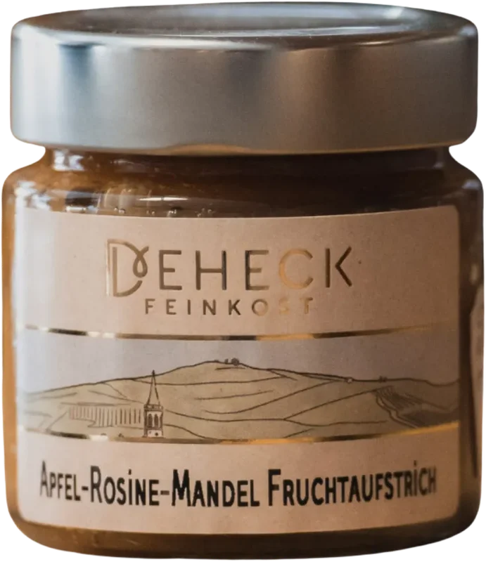 More information about Deheck Manufaktur apple raisin almond spread A tantalizing combination of the taste of fruity-sweet apples, juicy raisins and crunchy almonds.Our delicatessen fruit spread is perfect for gourmets. Spread the trio of almonds, raisins and apple on fresh bread or dip a croissant.This trio of flavors creates a balanced symphony of taste.Contents apple raisin almond spread: 140 g