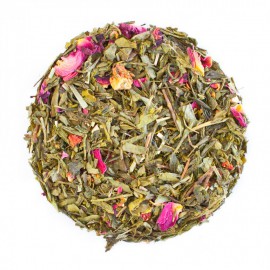 Zutaten: Sencha Grüntee, Zitronengras, Rosenblüten, Erdbeerblätter, Aroma.