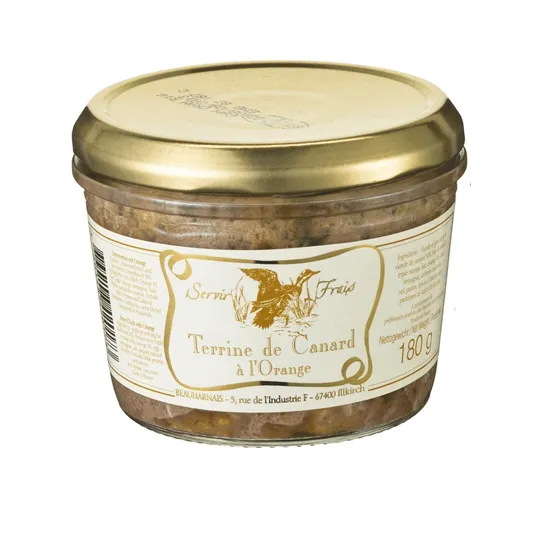 Fleischterrinen, insbesondere Wildterrinen, gehören zum kulinarischen Erbe Frankreichs. Die kräftig-würzige »Terrine de Canard à l’Orange« hat mit 25 % einen hohen Anteil an Wildfleisch, der mit Armagnac und Orangenlikör verfeinert wurde. Direkt gebrauchsfertig passt die Ententerrine mit Orange hervorragend zum Aperitif auf Baguette rustique, zu dunklem Landbrot oder kann mit mit Salat ergänzt als Vorspeise gegessen werden. Perfekte Begleiter der Wildterrine sind fruchtige Chutneys oder französische Cornichons.