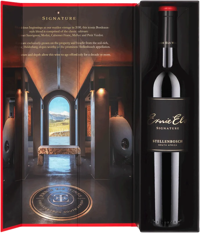 More information about Ernie Els Signature 2017 The Ernie Els Signature is the estate’s best red wine and impresses in the glass with its dark color, which ranges from garnet to ruby red. The bouquet already reveals the multifaceted richness of the cuvée of Cabernet Sauvignon (60%), Merlot (25%), Cabernet Franc (5%), Malbec (5%) and Petit Verdot (5%): Aromas of cedar and some lavender play around the notes of blackcurrants, mulberries and plums. Nuances of leather and a pinch of cinnamon add spicy accents. Concentrated notes of dark fruit characterize the taste of Ernie Els Signatures, while velvety tannins caress the palate. Enjoy this long-lasting red wine, which has matured for eighteen months in French oak, with spicy dishes, game or dark meat. But you should also definitely try the Ernie Els Signature on its own.