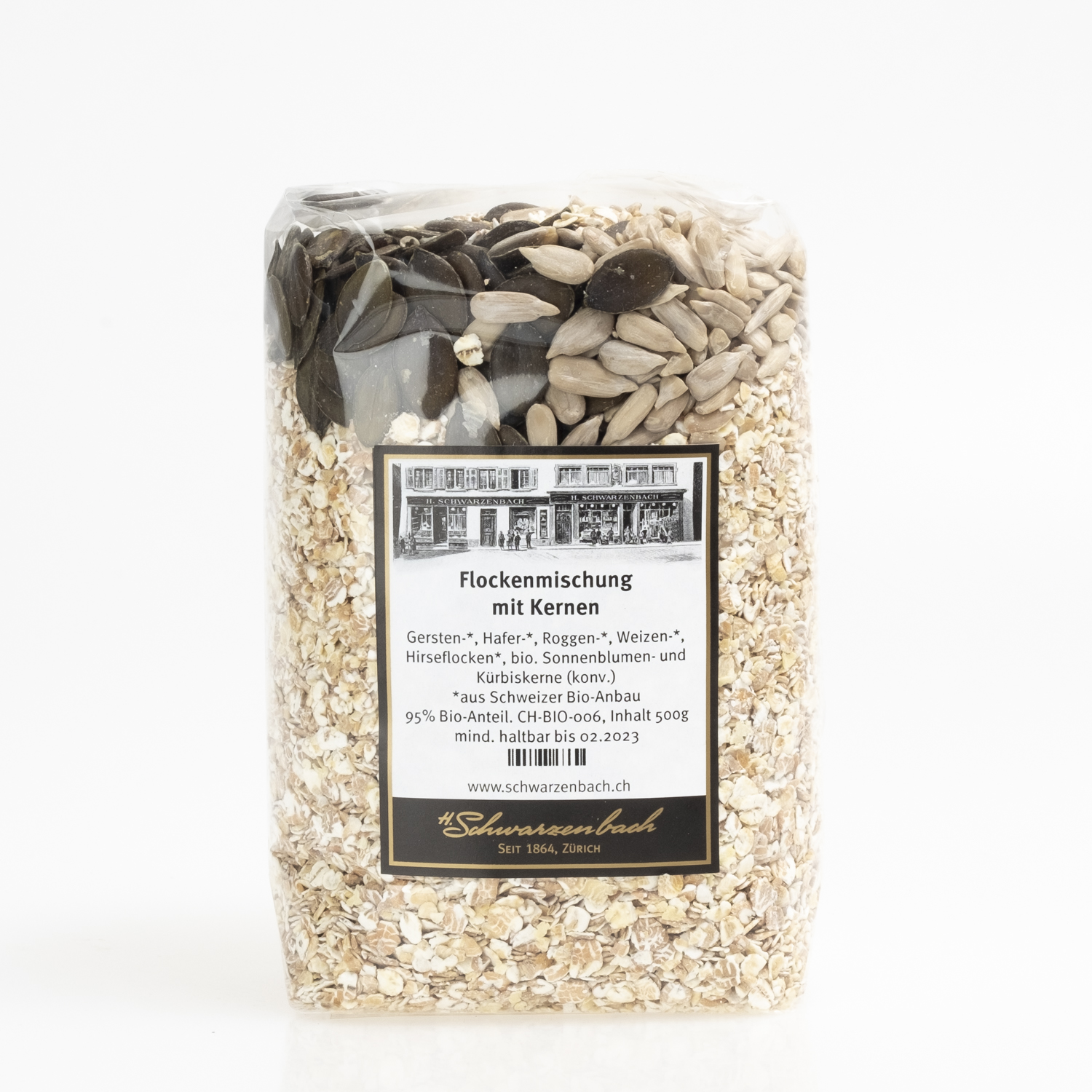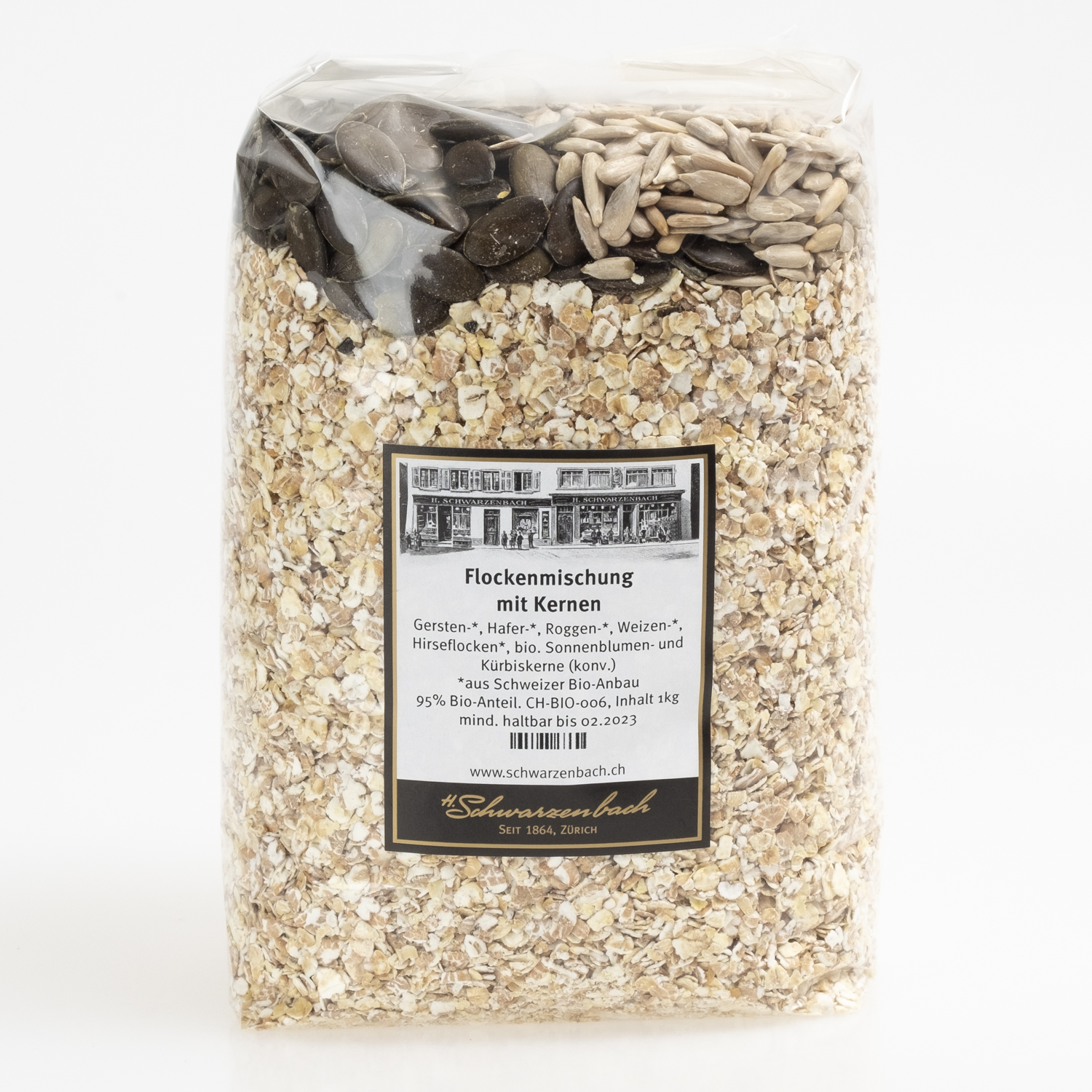 Eine biologische Flockenmischung mit Gersten-, Hirse-, Hafer- und Roggen- und Weizenflocken aus Schweizer Anbau, angereichert mit Schweizer bio Sonnenblumen- und Kürbiskernen.