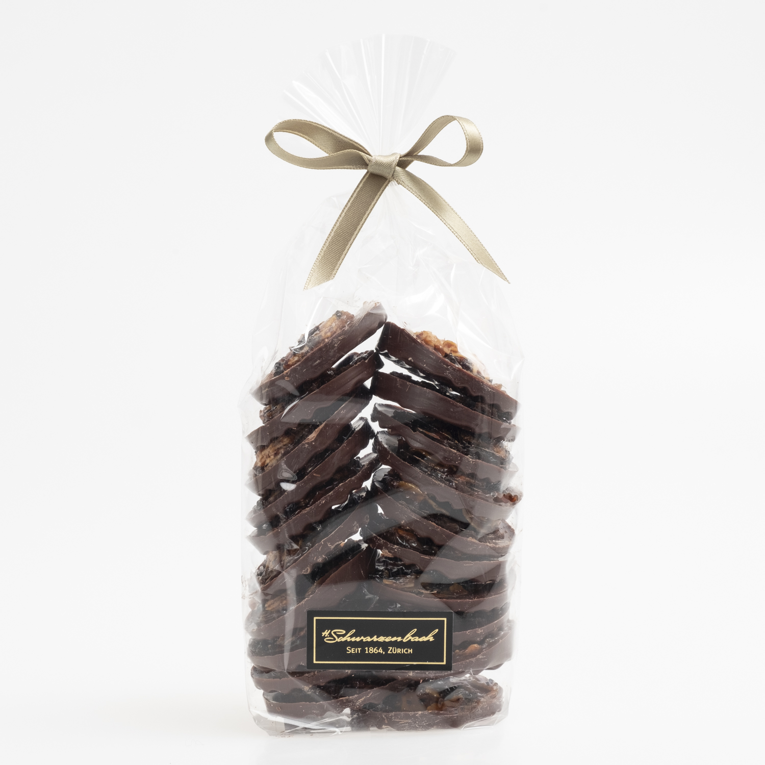 Delicious dark chocolate with caramelised almonds and sour cherries