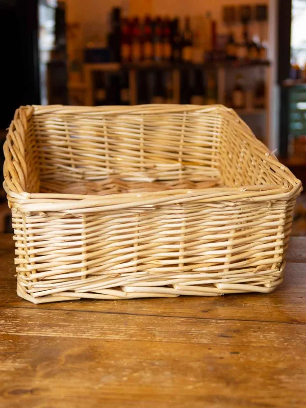 Quadratischer geflochtener Korb in heller Naturfarbe zum Selbstbefüllen mit den Abmessungen 31x26x10cm, gefüllt mit Sizzle-Pack oder Holzwolle.Verwendbar für Präsente im Wert von ca. 25-50 Euro (etwas abhängig von der Größe der Artikel/Produkte).