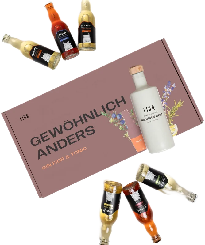 Alle Informationen zu Gin FIOR Gin & Tonic Probierpaket Die exklusive FIOR YOU Geschenkbox passt für jeden Anlass: Geburtstage, Jahrestage, Weihnachten oder als Mitbringsel für die nächste Einladung. Sie ist aber auch die perfekte Kennenlernbox für dich, um auf den FIOR-Geschmack zu kommen. Das zarte Fever Tree Mediterranean Tonic Water umschmeichelt den Gin FIOR und lässt seine feinen Noten am Gaumen tanzen. Das frische Indian Tonic Water sorgt dafür, dass die kräftigen und ausbalancierten FIOR-Aromen in den Vordergrund treten. Die Flaschen werden in einer dekorativen Holzbox mit der Aufschrift “FIOR YOU” auf Sizzle-Paper gebettet.Inhalt der exklusiven Gin FIOR Geschenkbox:1x Gin FIOR – Premium London Dry Gin – 0,5 l | 40 % vol.Ein London Dry Gin, der mit seinen handverlesenen Botanicals ein unverwechselbares Trinkerlebnis bereitet. Feine Noten aus Lavendel, Zitrus und Apfel, gepaart mit dem typischen Wacholdergeschmack sowie einem Hauch von Rosmarin, Kardamom, Zimt und Ingwer machen den Gin FIOR so besonders.Lead Botanicals: Wacholder, Lavendel, Apfel2x seeside Tonic Water classic – 0,2 lseeside Tonic fertig abgefüllt mit SodaZutaten: Wasser, Zucker, Chinarindenextrakt, Zitronensaft, Limettensaft, Säuerungsmittel Zitronensäure, OrangensaftNährwerte pro 100 ml: Brennwert: 132 kJ/32 kcal | Fett: 0 g | davon gesättigte Fettsäuren: 0 g | davon ungesättigte Fettsäuren: 0 g | Kohlenhydrate: 7,5 g | davon Zucker: 7,5 g | Eiweiß: 0,0 g | Salz: 0,0 g1x seeside Tonic Water Birne – 0,2 lseeside Tonic Water mit Birnengeschmack fertig abgefüllt mit SodaZutaten: Wasser, Zucker, Chinarindenextrakt, Zitronensaft, Limettensaft, Birnensaftkonzentrat, Säuerungsmittel Zitronensäure, OrangensaftNährwerte pro 100 ml: Brennwert: 142 kJ/34 kcal | Fett: 0 g | davon gesättigte Fettsäuren: 0 g | davon ungesättigte Fettsäuren: 0 g | Kohlenhydrate: 7,8 g | davon Zucker: 7,8 g | Eiweiß: 0,0 g | Salz: 0,0 g1x seeside Tonic Water Himbeere – 0,2 lseeside Tonic Water mit Himbeergeschmack fertig abgefüllt mit SodaZutaten: Wasser, Zucker, Chinarindenextrakt, Zitronensaft, Limettensaft, Himbeersaftkonzentrat, Säuerungsmittel Zitronensäure, OrangensaftNährwerte pro 100 ml: Brennwert: 140 kJ/34 kcal | Fett: 0 g | davon gesättigte Fettsäuren: 0 g | davon ungesättigte Fettsäuren: 0 g | Kohlenhydrate: 7,7 g | davon Zucker: 7,7 g | Eiweiß: 0,0 g | Salz: 0,0 g1x seeside Tonic Water Zwetschke – 0,2 lseeside Tonic Water mit Zwetschkengeschmack fertig abgefüllt mit SodaZutaten: Wasser, Zucker, Chinarindenextrakt, Zitronensaft, Limettensaft, Pflaumensaftkonzentrat, Säuerungsmittel Zitronensäure, OrangensaftNährwerte pro 100 ml: Brennwert: 155 kJ/37 kcal | Fett: 0 g | davon gesättigte Fettsäuren: 0 g | davon ungesättigte Fettsäuren: 0 g | Kohlenhydrate: 8,6 g | davon Zucker: 8,6 g | Eiweiß: 0,0 g | Salz: 0,0 g1x seeside Tonic Water Stachelbeere – 0,2 lseeside Tonic Water mit Stachelbeergeschmack fertig abgefüllt mit SodaZutaten: Wasser, Zucker, Chinarindenextrakt, Zitronensaft, Limettensaft, Stachelbeersaftkonzentrat, Säuerungsmittel Zitronensäure, OrangensaftNährwerte pro 100 ml: Brennwert: 143 kJ/34 kcal | Fett: 0 g | davon gesättigte Fettsäuren: 0 g | davon ungesättigte Fettsäuren: 0 g | Kohlenhydrate: 8 g | davon Zucker: 8 g | Eiweiß: 0,0 g | Salz: 0,0 g