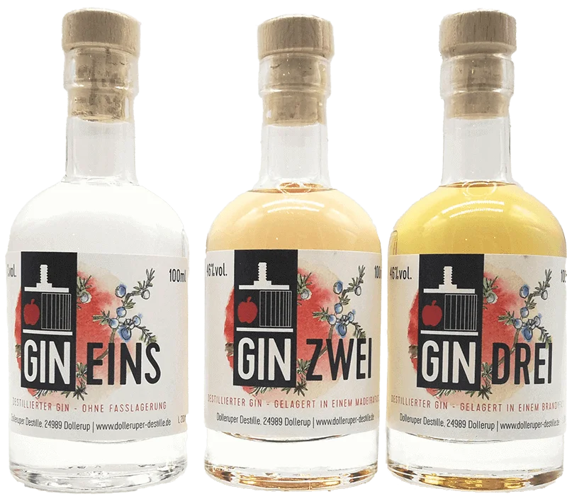 Alle Informationen zu Gin Trio Unser neues GIN TRIO ist da. Das Ausgangsprodukt aller drei Flaschen ist ein dreifach destillierter Gin mit gemahlenem Wacholder, Sanddorn, Zitrusfrüchten, Hibiskus und ausgewählten regionalen Beeren. Der zweite und dritte Gin wurde jeweils über ein Jahr in einem Fass gelagert. Die unterschiedlichen Farb- und Geschmacksnuancen sind somit nur auf die verschiedenen Fasslagerungen von GIN ZWEI und DREI zurückzuführen.Gin Eins: ohne FasslagerungGin Zwei: gelagert in einem MadeirafassGin Drei: gelagert in einem BrandyfassAbgefüllt wurden alle drei Gins mit 46 % Vol.