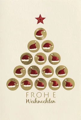 Ausgefallene Grußkarte mit hochwertiger Goldfolienprägung mit individueller Beschriftung für die persönliche Note Ihres Weinpräsentes.Weihnachtsgrußkarte Zipfelmützen im Versand der Saale Unstrut Wein