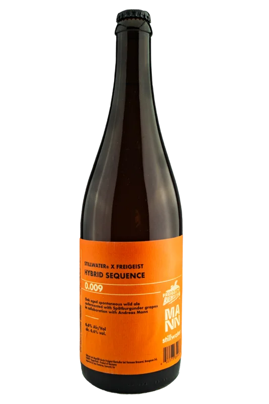 More information about Hybrid Sequence 0.009 Hybrids are the latest obsession of modern craft brewers: the experimental men and women in the brewhouses are no longer satisfied with simply making beer from water, hops, malt and yeast. Instead, they are venturing into unconventional raw materials, barrel ageing and innovative techniques. Marrying beer and wine is one of these techniques and initially met with resistance in the industry. According to traditionalists, wine has no place in beer. The charming, surprisingly tasty hybrids argue against this.One of these extremely successful hybrids was created by Freigeist Bierkultur and their friends at Stillwater Artisanal. The Sauerland-American team chose the award-winning 2017 Pinot Noir from the Andrea Mann winery in Rheinhessen to ferment together with their wild ale. The ale is nicknamed „wild“ because it was spontaneously fermented using wild yeasts. These special yeasts stick to fruit skins and populate the air. They are much less controllable and assessable, which is why only the bravest brewers will tackle them. Freigeist Bierkultur has specialized in the use of these unpredictables and has proven once again with their Hybrid Sequence 0.009 that they know what they are doing.The oak-aged brew combines the dry, tart fruitiness of good red wine with the spicy yeast and velvety malt of beer. Fine!