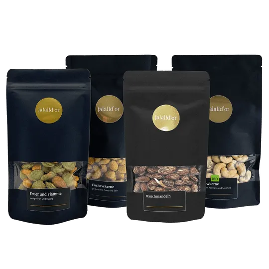 Nuss ist nicht gleich Nuss – daher ist das Team von Jalall D’or mit viel Liebe und Leidenschaft ständig auf der Suche nach der besten Lösung, dem besten Produkt, den interessantesten Projekten und der idealen Verpackung. Dieses Set enthält vier aufregende Edelnusssnacks: Wasabi-Erdnüsse, Chili-Cashewkerne und geröstete Salzmandeln, Rauchmandeln und gerösteten Cashewkernen mit Rosmarin oder Curry verführen die Sinne und lassen Geschmacksknospen jubeln.
