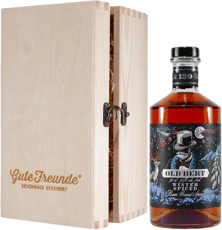 Alle Informationen zu Michlers Old Bert Winter Spiced Rum mit Geschenk-Holzkiste Michlers Old Bert Winter Spiced Rum ist ein wärmender und aromatischer Rum, der mit winterlichen Gewürzen und Aromen verfeinert wird. Dieser handgefertigte Spiced Rum bietet ein einzigartiges Geschmackserlebnis mit einer perfekten Balance aus süßen und würzigen Noten. Mit seiner tiefen bernsteinfarbenen Farbe und dem Aroma von Zimt, Nelken und Orangenschalen entführt er die Sinne in eine winterliche Welt des Genusses.Michlers Winter Rum kann pur genossen oder als Zutat in winterlichen Cocktails und Mixgetränken verwendet werden. Sein einzigartiges Geschmacksprofil verleiht den Getränken eine besondere Note und sorgt für ein warmes und behagliches Genusserlebnis. Dieser Rum ist die perfekte Wahl für alle, die den winterlichen Geschmack und das Ambiente genießen möchten.Keine Flaschen sehr lange (Sonnen)-Licht aussetzen, geschlossene Flaschen kühl und dunkel lagern.Rechtlicher HinweisAb 18! Dieses Produkt enthält Alkohol und darf nicht an Personen unter dem gesetzlichen Mindestalter abgegeben werden. Eine Lieferung an Minderjährige ist nicht möglich. Mit Ihrer Bestellung bestätigen Sie, dass Sie das gesetzlich vorgeschriebene Mindestalter haben. Bitte seien Sie verantwortungsvoll im Umgang mit diesem Artikel. Weitere Informationen unter kenn-dein-limit.info. Es wird keine Gewähr dafür übernommen, dass der gelieferte Artikel vollkommen identisch mit dem auf dem Online-Angebot gezeigten Bild ist. Dies gilt in besonderem Maße für nummerierte Abfüllungen, Jahrgänge und für Änderungen von Flaschenausstattungen und Verpackungen, die einem lieferantenseitigen Wechsel unterworfen sind. Bei den Bildern handelt es sich um Beispielbilder, die wesentlichen Merkmale des Artikels befindet sich in der Artikelbeschreibung.Der Markenname ist Eigentum des Rechteinhabers. Die Verwendung des Markennamens dient hier lediglich der Indentifizierung der Ware sowie der Kennzeichnung der Qualität und soll keineswegs eine Schutzrechtsverletzung darstellen.Brennerei/Inverkehrbringer: ALBERT MICHLER DISTILLERY INT. LTD BRISTOL, UNITED KINGDOM, BS8 2XN