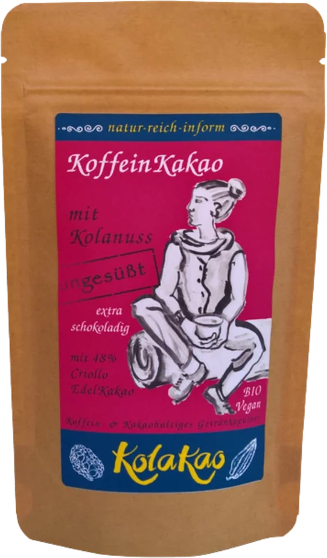 Alle Informationen zu natur-reich-inform Bio KolaKao Koffein- & Kakaohaltiges Getränkepulver mit Kolanuss, ohne Zuckerzugabe und ohne Gewürze.“Hast du Ärger und Verdruss – trinke eine Kolanuss“ ein Spruch aus Uromas Zeiten.Einfach aber effektiv, auf die Wirkung kommt es an und der extra schokoladige Geschmack ist Zugabe. Der Klassiker unter den KolanussKakaos ohne Zuckerzugabe, nicht viel drumherum nur einfach gut und in sich ruhend rund. Das Getränkepulver, wenn es auf die Kombination von lang anhaltendem KolanussKoffein und beglückendem Edelkakao im Alltag ankommt.Die ungesüßte Variante ist ohne Zusatz von Zucker oder weiteren Süßungsmitteln und daher bestens geeingnet für Gesundheitsbewusste, „Schwarz“-Trinker oder auch Diabetiker.Diese Mischung ist schokoladig – herb im Geschmack. Ein deutlich höherer Anteil an Kakao und Kolanuss bieten Dir die reinste und unverfälschte Wirkung der hochwertigen Inhaltsstoffe. Es ist eine Getränkepulver-Basis für all Jene die ihre eigene Vorstellung von würzen haben oder auch die edlen Rohstoffe an sich mögen und auf jeglichen Schnick und Schnack verzichten wollen. Fühlt Euch frei damit zu experimentieren oder einfach nur unverfälscht zu genießen.Der schwach entölte Criollo-Edelkakao aus Atalaya und die koffeinspendende Kolanuss sind Fair gehandelt aus Bio-Kooperativen in Südamerika.Zubereitung in 200ml: 1 bis 2 Teelöffel = 8g KoffeinKakao in in 80ml heißer Flüssigkeit mit einem Schneebesen oder Löffel einrühren. Nach Geschmack heiß oder kalt mit Milch, Pflanzendrink oder Wasser aufgießen. Idealerweise 2 Minuten ziehen lassen und bei Bedarf umrühren.Erhöhter Koffeingehalt: Für Kinder und schwangere oder stillende Frauen nicht empfohlen (30mg/100ml).Vegan & natürlich ohne Zusätze.