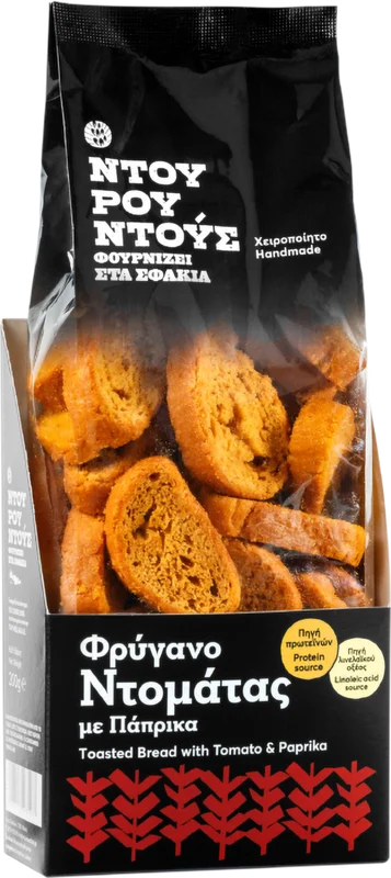 More information about Ntourountous Traditional Wheat Rusk Tomato & Pepper High in protein, without preservatives, contains wheat flour, milk, 5% tomato paste, yeast, salt, 0.3% hot paprika and extra virgin olive oil.Features:HandmadeRich in proteinWithout preservativesDietary fiberLow saturated fatLow sugar contentBakery Ntourountous from Crete SfakiaThe history of Ntourountous Bakery begins with Grandma Anna, who married into the village of Sfakia a century ago.All products are lovingly rolled by hand according to traditional Cretan recipes in the manufactory of Ntourountous family in Sfakia, island of Crete. The use of fine ingredients from the Greek nature guarantees high quality and a very special pleasure.