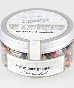 Red – green – white and black pepper mixed. Visually very beautiful in a glass pepper mill on the table!