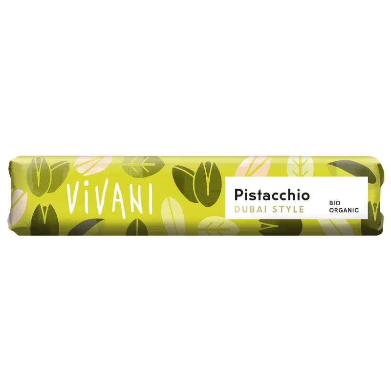 Vivani Pistacchio ist ein Vollmilchriegel, gefüllt mit einer feinen Pistazien-Crème und zart-crunchigen Gebäckstückchen