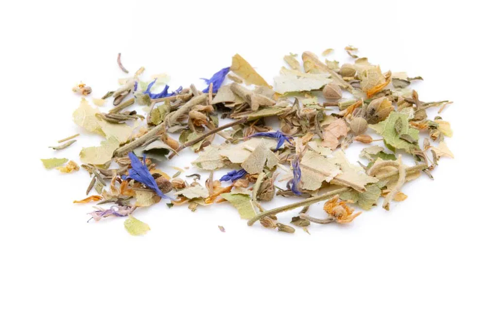 Zutaten: Silberlindenblüten (30 %), Anis, Quendelkraut (17 %), Thymian (10 %), Eibischblätter, Malvenblätter, Stiefmütterchenkraut, Kornblumenblüten.