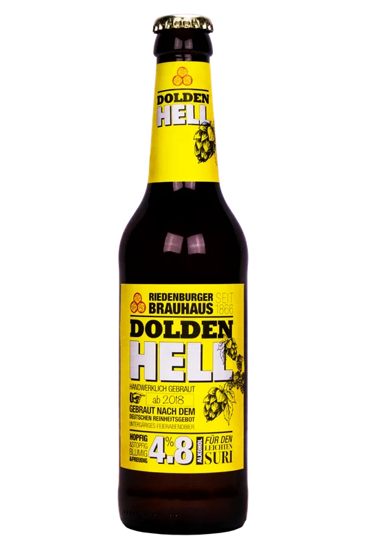 Alle Informationen zu Riedenburger Dolden Hell Die Craftbiere im Riedenburger Brauhaus drehen sich um eine einzige Zutat: Der Hopfen spielt die erste Geige, das kann man bereits an den Namen der Biere sehen. Alle Exemplare dieser Kategorie haben den Zusatz „Dolden“ und drücken damit ein hopfiges Versprechen aus.Neben dem alkoholfreien India Pale Ale Dolden Null und dem Bavarian Summer Ale Dolden Sommer Sud hat die Brauerei ein hopfenbetontes Helles im Repertoire. Ihr saftiges Dolden Hell wird mit vier verschiedenen Hopfensorten gebraut und zur Intensivierung der Geschmacksnuancen zusätzlich noch kaltgehopft. Die naturtrübe Bierspezialität zeichnet sich durch ihren milden, feinsinnig ausbalancierten Charakter aus und punktet mit weicher Süße und frischer Hopfen-Aromatik. Alle verwendeten Hopfensorten stammen aus kontrolliert biologischem Landbau und sind mit dem Bioland-Siegel versehen.Das Riedenburger Dolden Hell fließt in einem pfirsichroten Sonnengelb ins Glas und schmückt sich mit einer blütenweißen Krone. Aus dem naturtrüben Gerstensaft steigt ein Bouquet aus hellem Malz, floralem Hopfen und säuerlichen Zitrusfrüchten in die Nase. Der Geschmack setzt den olfaktorischen ersten Eindruck fort und liefert Noten von Zitrusschalen, reifer Ananas, frisch gemähtem Gras, blühender Sommerwiese und exotischer Passionsfrucht. Das Malz untermalt das Hopfenfest mit soliden Keks-Anklängen und zurückhaltenden Getreidenoten. Der schlanke Körper und die prickelnde Kohlensäure verleihen dem Bier eine schöne Eleganz.
