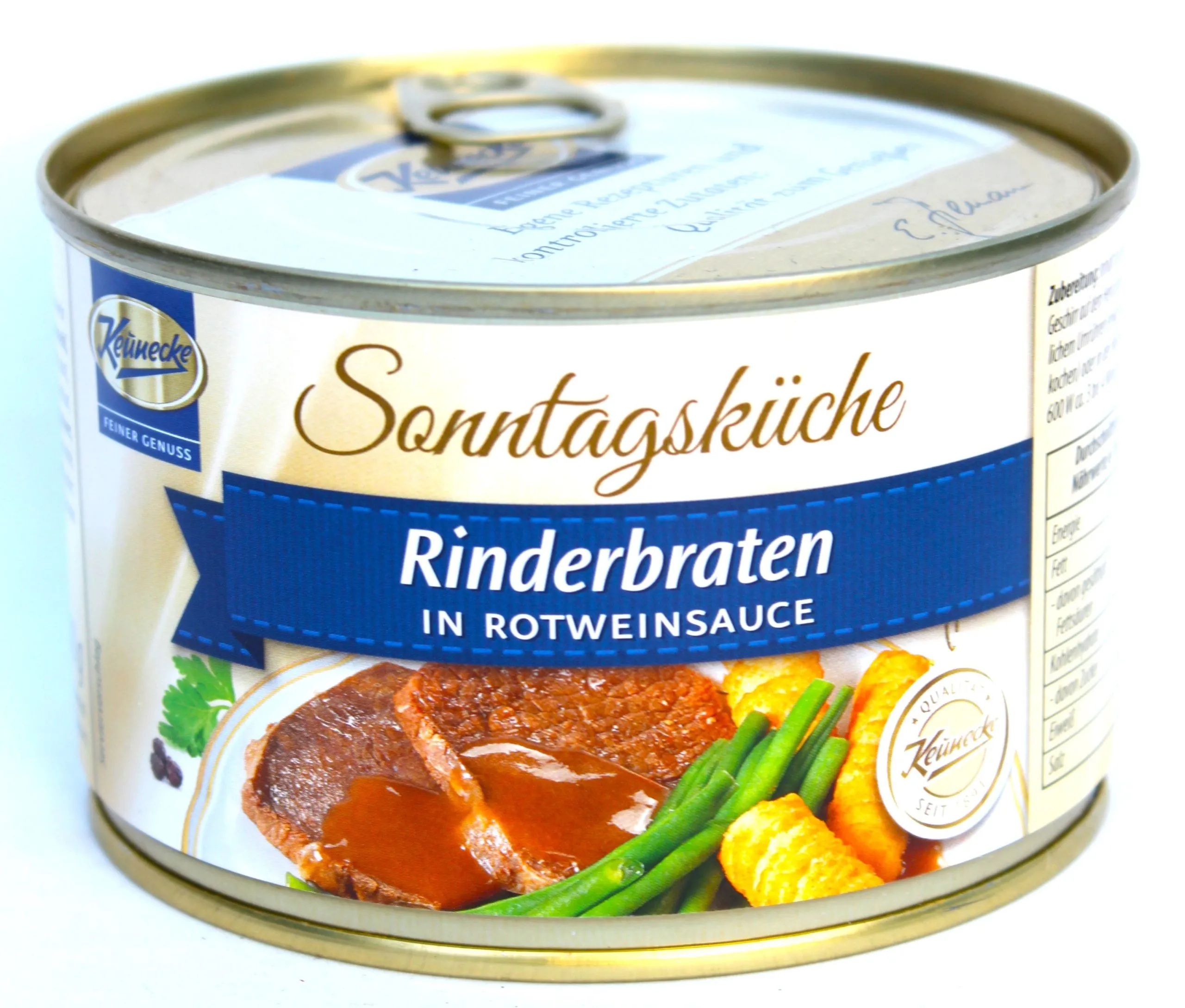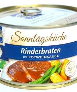 Trinkwasser, Rindfleisch vorgegart (33%), Rotwein (2%), modifizierte WEIZENSTÄRKE, Rapsöl, WEIZENMEHL, Tomatenmark, jodiertes Speisesalz (Speisesalz, Kaliumjodat), Zucker, Verdickungmittel (Guarkernmehl, Carrageen, Xanthan), eiweißangereichertes MOLKENPULVER, MAGERMILCHPULVER, SENFMEHL, Branntweinessig, Würze, Gewürze, Gewürzextrakte, Rindfleischextrakt, Hefeextrakt, Karamellzucker, Stabilidator (Diphosphate), Palmöl, LAKTOSE, Sonnenblumenöl, Aroma (enthält SELLERIE).