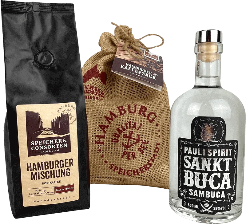 More information about Sankt Buca Sambuca & Hamburger coffee bag The complete package for connoisseurs: a bottle of deliciously mild Sankt Buca Sambuca (500ml) and a packet of strong, aromatic „Hamburger Mischung“ whole bean coffee (250g) from Speicher & Consorten in a rustic coffee bag.A glass of Sankt Buca with a few coffee beans and a hot cup of coffee – Hamburger Mischung, of course – is the perfect end to a good meal! Sankt Buca is a passionately sweet and seductive sambuca that mercilessly conquers the hearts of seasoned sea dogs. The best star anise distillate and the perfect mix of other first-class ingredients ensure an intoxication of the senses. Tastes great iced or flambéed, with coffee beans or pure – simply really good! Hamburg blend in a coffee bag (whole bean) Tastes like a real Hamburg coffee should taste: Strong, aromatic, delicious! Fine Arabica from Africa and India with a balanced aroma meets strong, spicy Robusta India Monsoon. Long and gentle roasting in a classic drum roaster makes this a really good Hamburg coffee!Recommendation: Do not brew the coffee with boiling water, but at 90-95 degrees for even more aroma.Variation: Try adding 2cl of Sankt Buca directly to a hot cup of coffee – hot, sweet and spicy!