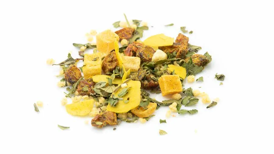 Zutaten:COUSCOUS, MANDELN, Papaya, Mango, Petersilie, Würzmischung (Salz (60 %), Gemüse (31%) (Möhre, Pastinake, Zwiebel, Kartoffel, SELLERIE, Lauch, Paprika, Petersilie, Knoblauch), Zucker, Hefeextrakt, Gewürze (Pfeffer, Kurkuma, Dill), Maisstärke), Berberitzen, Cranberrys (Cranberry, Zucker), Nana-Minze, Kumin, Kurkuma, Tomaten, Meersalz, Chili