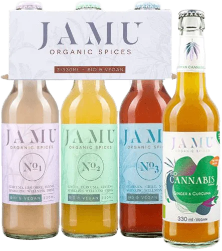 More information about Tasting package JAMU 3-pack JAMU Wellness Drinks + 3 BIO Cannabis DrinksRich in valuable ingredientsnaturalVegan & gluten-freeContents:1x Jamu No 1, 0.33 lJamu No1 is the beauty elixir among our drinks. Ginger, curcuma, vanilla, ginseng and fennel give it superpowers that can strengthen your hair and nails, moisturize your skin and stimulate the body’s own collagen production. They are also said to neutralize free radicals and stimulate the immune system. Curcuma supports nutrient absorption and cinnamon is a great source of manganese, iron and calcium. The combination of these effective ingredients, which have been tried and tested for over 1000 years, is rich in vitamin C, antioxidants and trace elements.Ingredients: Mixture of spice extracts* (fennel seeds*, ginger*, cinnamon*, curcuma*, ginseng*, vanilla*), grape juice concentrate*, lemon juice*, elderberry juice*, aloe vera juice*, carbonic acid *from certified organic farmingNutritional values per 100 ml: Energy: 82 kJ / 19.5 kcal | Fat: 1x Jamu No 2, 0.33 lThe herbal drink Jamu No2 can contribute to relaxation and a restful sleep. It owes this to a miracle plant, ginseng, which was worth its weight in gold in ancient China. This all-rounder can not only boost the production of the „happiness hormone“ serotonin, but also reduce the level of the „stress hormone“ cortisol. The millennia-old combination of beneficial ingredients can lower cholesterol levels and blood pressure, while at the same time activating the immune system and metabolism, thus enabling holistic regeneration.Ingredients: Mixture of spice extracts* (ginger*, curcuma*, coriander*, ginseng*), grape juice concentrate*, lemon juice*, carrot juice*, lemon oil*, carbonic acid *from certified organic farmingNutritional values per 100 ml: Energy: 82 kJ / 19.5 kcal | Fat: 1x Jamu No 3, 0.33 lThe power of ginger, ginseng, cardamom and guarana make JAMU No3 a natural energizer. Ginseng and ginger can speed up the metabolism and ensure the release of the happiness hormone serotonin – concentration and stamina can be increased. Guarana also has a stimulating effect on the senses and is a real stimulant that has five times the power of caffeine. There is also black pepper, nutmeg and chili, whose essential oils and micronutrients can improve blood circulation. In addition, many of the herbs in the recipe have one thing in common: they were already described in the Kamasutra as effective aphrodisiacs.Ingredients: Mixture of spice extracts* (ginger*, hibiscus*, cardamom*, guarana*, curcuma*, ginseng*, chili*, coriander*, pepper*, nutmeg*), grape juice concentrate*, lemon juice*, aronia juice*, carbonic acid *from certified organic farmingNutritional values per 100 ml: Energy: 82 kJ/19, 5 kcal | Fat: 3x Jamu Cannabis Drink, 0.33 l eachIn its purest form, CBD does not provide the enhanced benefits of the whole plant (known as the entourage effect – the full – spectrum of cannabinoids, terpenes and essential oils extracted from the plant that work together to enhance the therapeutic benefits of each individual cannabinoid).The full-spectrum extract is credited with potentially helping to treat anxiety, depression, muscle pain, migraines, insomnia and many other ailments.Ingredients: Hemp extract 43%*, grape juice from grape juice concentrate*, ginger extract*, lemon juice*, turmeric extract*, carbonic acid. Naturally contains sugar. *From certified organic cultivationNutritional values per 100 ml: Energy: 81 kJ/19 kcal | Fat: 0g | of which saturated fatty acids: 0g | Carbohydrates: 4.7g | of which sugar: 4.5 g | Protein: 0g | Salt: 0g