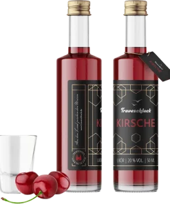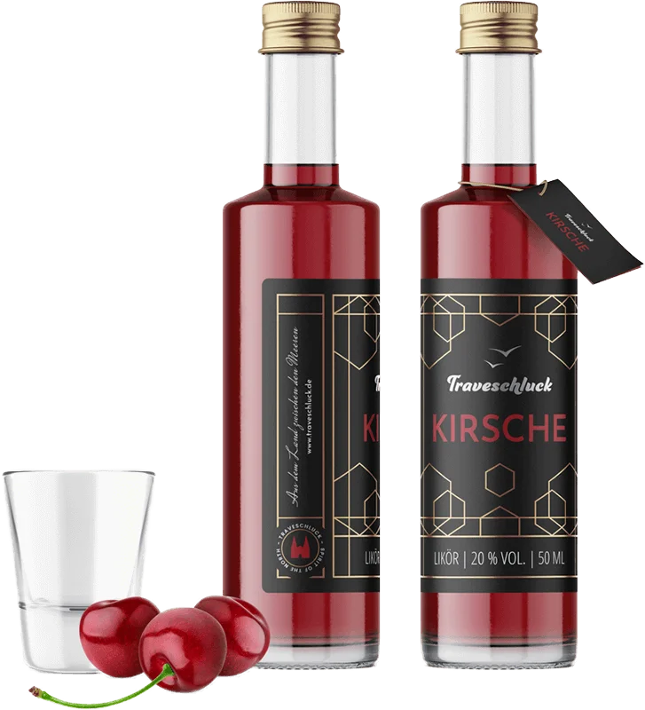 More information about Traveschluck Kirsche Liqueur | 20 % vol. | 50 ml / 500 mlTraveschluck Kirsche is a fruity liqueur that tastes of fresh fruit and doesn’t stick to the palate. North German understatement to enjoy.The combination of tasty cherry and fine grain is well known, but here it surprises with its intense fruitiness. It is also incredibly versatile: enjoyed neat as a liqueur, it makes a wonderful relaxing drink at the end of the day. Infused with sparkling wine or mineral water, it becomes a sparkling experience.The decorative bottle with screw cap not only sits comfortably in the hand, it is also pleasing to the eye and is therefore perfect as a gift or souvenir.A cherry liqueur as sensual as the sea, as versatile as the Trave and as warm as the people. Exquisite cherries and fine grain awaken a love of the north.