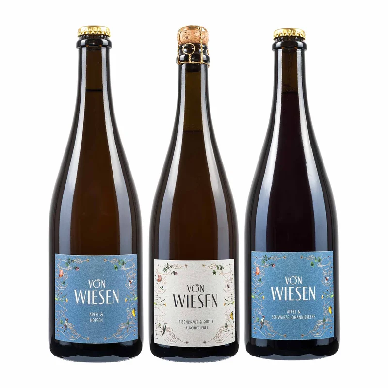 von Wiesen | Probierpaket mit 3 Flaschen Das von Wiesen Probierpakt bietet Dir die Möglichkeit drei unterschiedliche Produkte von Niko Brandners neuestem Projekt auf einmal zu probieren. Daß Niko Brander Sekt machen kann, das ist unumstritten, bereits seit ein paar Jahren gehört er zu den Top Sektmachern Deutschlands – Griesel Sekt ist die Spitze der Deutschen Sektliga. Seinem Qualitätsversprechen treu bleibend stellt Niko nun Schaumwein aus heimischem Obst her. Mit feiner Perlage und knochentrockenem Geschmacksbild ist er gut gekühlt ein herrlicher Erfrischer und ein guter Essens-Begleiter. Im von Wiesen Probierpaket sind enthalten 1 Flasche von Wiesen Ancestral Apfel & Hopfen: Der von Wiesen Ancestral Apfel mit Hopfen ist knochentrocken mit Noten von grünem und gelbem Apfel und feiner Perlage. Der Hopfen steuert blumige Noten mit, wie du sie vielleicht vom Pale Ale kennst. Der Schaumwein duftet herrlich wie frisch gebackenes Hefebrot. 1 Flasche von Wiesen Alkoholfrei: In der Nase super duftige Verbene, wie das Eisenkraut auch genannt wird, am Gaumen feinperlig, wunderbar trocken. Die Quitte steuert eine subtile Fruchtsüße bei, der Hopfen eine speichelflussfördernde Bitterkeit und der fermentierte Knollensellerie bringt als Umamibombe Tiefe und Komplexität in den von Wiesen Eisenkraut Quitte alkoholfrei. 1 Flasche von Wiesen Ancestral Apfel & rote Johannisbeere: Dieser von Wiesen Ancestral ist mit 0,0g/l Restzucker knochentrocken mit Noten von gelbem Apfel. Die rote Johannisbeere bringt eine spürbare Säure und rotbeerige, herbe Fruchtnoten mit, auch das leicht Hefige wie von frischem Hefezopf ist zu spüren. Die Méthode Ancestral Die Méthode Ancestral ist eine traditionelle, in Frankreich z.B. im Rhônegebiet oder im Languedoc bzw. Roussillon beheimatet, fast in Vergessenheit geratene Methode zur Schaumweinherstellung. Bei dieser Vorgehensweise braucht es keine, wie sonst üblich, zweite Gärung in Flasche oder Tank, sondern nur eine einzige. Niko Brandner lässt den Apfelmost zunächst spontan angären, versetzt ihn mit Citra Hopfen und füllt ihn dann in die klassische Schaumweinflasche ab. Mit dem Kronkorken verschlossen bleibt nun das durch die fortwährende Gärung entstehende Kohlendioxid in der Flasche. Das Kohlendioxid verbindet sich mit dem Most und es entsteht eine feine, gut eingebundene Perlage. Der entstandene Perlwein, der auch als Ancestral, Pétillant Naturel bzw. Pét Nat bezeichnet wird, ist ungefiltert, enthält noch leichte Hefe Rückstände und ist daher etwas trüb, so wie bei naturtrübem Apfelsaft. Bitte die Flaschen Ancestral vorsichtig öffnen, da der Druck in der Flasche Varianz zeigt. Im von Wiesen Probierpaket erwarten Dich drei Getränke des Winzers. Probier Dich durch.