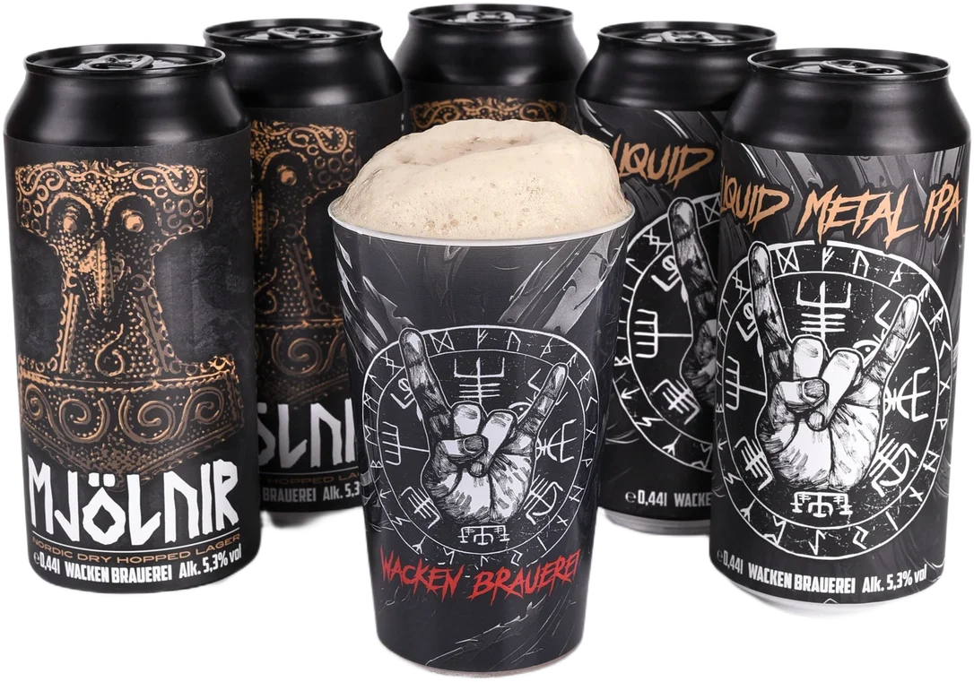 More information about Wacken Festival Pack The Wacken Brewery has put together a limited, cool and ultra-tasty beer package for the festival summer: Two fresh, hop-packed beers, bottled in a can, and the iconic mug with the Vegvisir motif. The package contains two cans of the unique Liquid Metal IPA and three cans of the awesome lager Mjölnir.This is included in the package3x Mjölnir Nordic Lager in a can – 0.44 l | 5.3 % vol.The Beer of the Gods Pilsener was dedicated to this mighty, divine hammer. Forged, it is radiantly bright, drinkable and fruity-fresh at the same time. The beer is natural and unfiltered. In short, a divine drink.Taste: fruity-fresh, drinkableBeer style: bottom-fermented lager beer, Pilsner brewing style2x Liquid Metal IPA in a can – 0.44 l | 5.3 % vol.Our crisp Liquid Metal IPA is pure hard rock. Stuffed with the American aroma hops Simcoe, Summit and Crystal, it plays powerful fresh and fruity riffs on the tongue and palate. The balanced body and distinctive bitterness rock this fruit bomb down the throat with a good 5 revolutions.Taste: fresh, fruity, hoppy and bitterHops: Simcoe, Summit, Crystal1x Wacken plastic cup VegvisirFilling volume: 0.3 l, calibrated