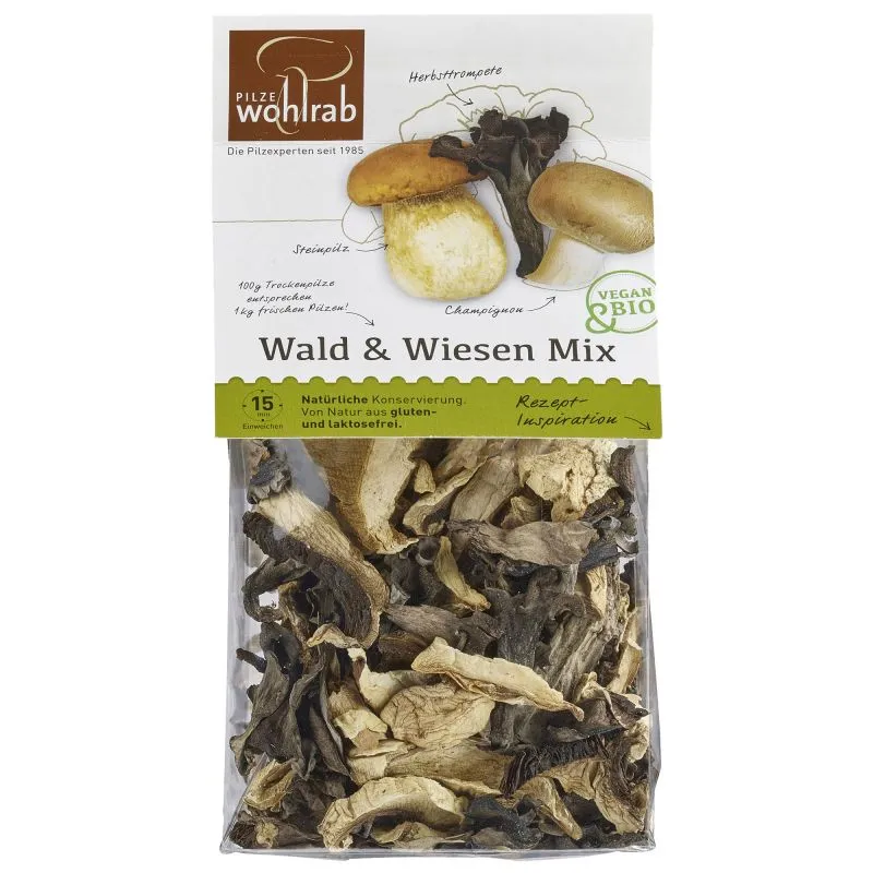 Wald & Wiesen Mix von Pilze Wohlrab ist aromaschonend getrocknet. Der nussige Steinpilz die würzige Herbsttrompete und der schmackhafte Champignon machen diesen Mix so kostbar. Für herbstliche Gerichte und auch als aromatische Würze in vegetarischen und veganen Rezepten. Der Wald & Wiesen Mix von Pilze Wohlrab ist ökologisch erzeugt bzw. Bio-zertifiziert und trägt das EU-Bio-Siegel