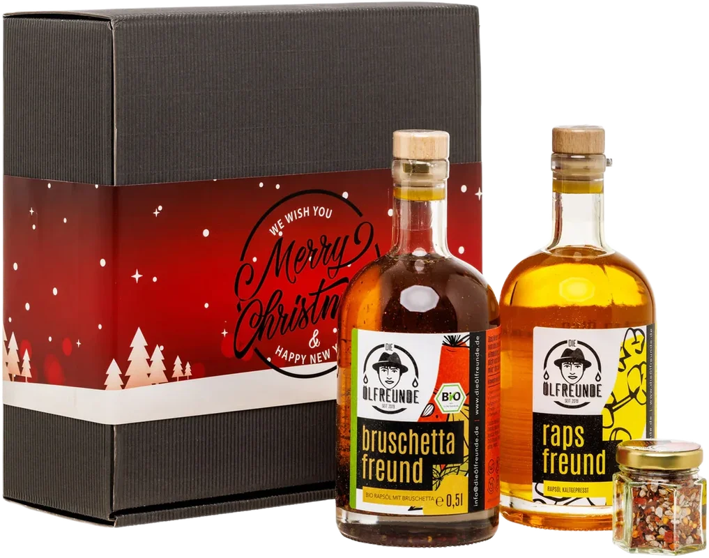 Alle Informationen zu Weihnachtsbox Weisse Weihnacht Noch auf der Suche nach einem passenden Geschenk für die Weihnachtszeit? Wir haben für dich einen passenden Geschenkkarton mit unseren liebsten Artikeln zusammengestellt.Unsere Produkte sind ab Bestelldatum ungeöffnet mindestens 8 Monate haltbar.Das ist im Paket enthalten1x Bio Bruschettafreund – Rapsöl mit Gewürzen – 0,5lDas Meer rauscht, die Grillen zirpen und ein Hauch von Dolce Vita weht um deine Nase? Dann hast du eindeutig zu viel Bio Bruschettafreund gedippt und dich von Balkonien nach Italien geträumt. Oh sole mio – darauf noch ein Tröpfchen.Zutaten: bio Rapsöl, bio Gewürze (Tomate, Knoblauch, Zwiebel, Meersalz, Paprika, Basilikum, Chili, Oregano, Thymian, Liebstöckl, Pfeffer)Nährwerte pro 100ml: Energie: 3389 kJ/824 kcal | Fett: 91,6 g | davon gesättigte Fettsäuren: 6,9 g | Kohlenhydrate: <0,1 g | davon Zucker: <0,1 g | Eiweiß: <0,1 g | Salz: <0,01 g | Omega 3-Fettsäuren: 8,7 g1x Rapsfreund – Rapsöl – 0,5lWe proudly present die Nummer 1 unter den Ölen: Deeeeeer Rapsfreund! Sogar der Sonnengott Ra würde ihn in den Himmel aufnehmen.Zutaten: reines kaltgepresstes RapsölNährwerte pro 100ml: Energie: 3389 kJ/824 kcal | Fett: 91,6 g | davon gesättigte Fettsäuren: 6,9 g | Kohlenhydrate: <0,1 g | davon Zucker: <0,1 g | Eiweiß: <0,1 g | Salz: <0,01 g | Omega 3-Fettsäuren: 8,7 g1x Chilisalz – 30 gUnser kleines Chillisalz ist grobkörnig und optimal für die Salzmühle. Deinen Spaghetti fehlt der letzte Pfiff? Hau noch 1, 2 oder auch 3 Umdrehungen mit deiner Salzmühle von unserem Chillisalz drüber.Zutaten:grobes Alpensalz, Chili