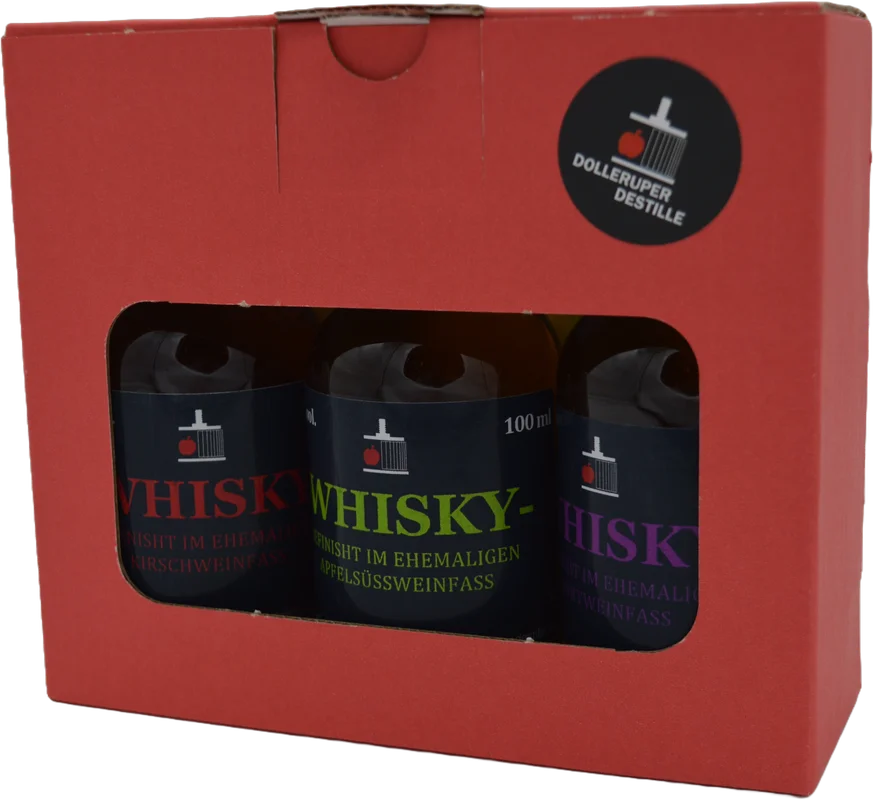 More information about Whisky set of 3 3 bottles of 100 ml each with 46% vol. in a set!Here we have imported a „finished“ whisky from Scotland after maturing for over three years in cask strength at 62% vol. and then divided it into three different casks. It was then matured in these for a further two years. Any differences between the three individual samples are therefore based solely on the type of barrel used for maturation.Barrel 1: Sweet apple wine barrelBarrel 2: cherry wine barrelBarrel 3: Port wine barrelWe bottled at 46% vol. – adding a drop of water releases even more aromas.