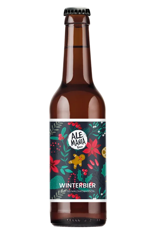 Alle Informationen zu Winterbier Während wir im Sommer gerne federleichte Sauerbiere und Braustücke mit fruchtiger Vielfalt und schlankem Körper trinken, darf es im Winter gerne etwas üppiger sein. Eisige Kälte, grauer Schneematsch, ungemütlicher Dauerregen und der Stress im Advent zerren an unserem Nervenkostüm und wir sehnen uns nach geruhsamen Stunden auf dem Sofa. Bei Kerzenschein, dem ein oder anderen Plätzchen und dem passenden (Heiß)Getränk atmen wir durch und sammeln Kraft für die nahenden Festtage. Glühwein, Grog, Kakao, Tee und heiße Schokolade sind fabelhaft, doch nichts wärmt Leib und Seele so wunderbar wie ein würziges Winterbier. Die Bonner Brauerei Ale-Mania bringt jedes Jahr ein solches Winterbier heraus und hat sich 2023 mal wieder selbst übertroffen: Ihre diesjährige Kreation wird mit einer ganzen Reihe stärkender Rohstoffe gebraut und macht mit seinem opaken Rostrot und der cremigen, buttergelben Schaumkrone eine äußerst gute Figur im Glas. Das winterliche Schmankerl enthält sechs verschiedene Malzsorten, die nicht nur für die tolle Farbe, sondern auch für ein himmlisches Röstaroma, weiche Karamellnoten und die griffige Textur sorgen. Einen würzigen Kick liefern die Hopfensorten Perle, Mittelfrüh und Spalter, die allesamt aus deutschen Anbaugebieten stammen. Abrundender Faktor sind die wärmenden 6,2 %, die dem komplexen, süffigen Braustück den nötigen Wumms verleihen.