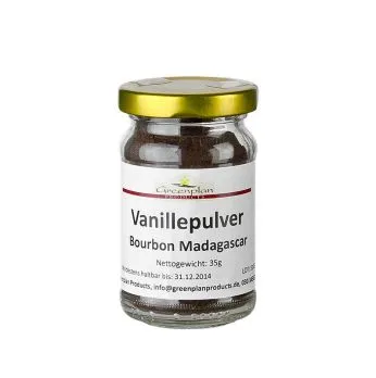 Vanillepulver. Zutaten: Bourbon Vanille gemahlen. Hergestellt in Madagascar.Eigenschaften: Es müssen keine Nährwerte angegeben werden.