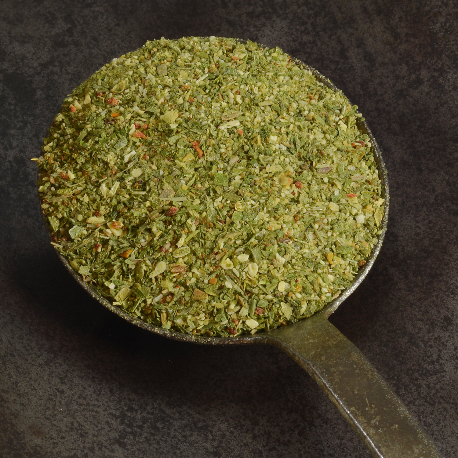 Gewürzmischung mit Zwiebeln, Knoblauch, Petersilie, Schnittlauch und weiteren Zutaten. Geeignet zu Fleisch, über Gemüse und in Dips.
