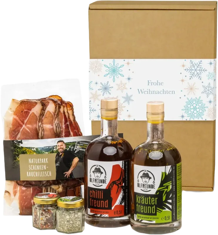More information about Christmas box Oh du Fröhliche „Oh you merry“ – everyone will be grooving along with this box. If you like lots of delicious content, then this box is more than suitable. This is included in the package1x Kräuterfreund – rapeseed oil with herbs – 0.5 lGrandma is having a nap and you don’t have any herbs to hand? There’s a herb for that too! Let the herb friend come into play. Spice up your salad dressing, make a delicious bruschetta or dip it pure. This herb bomb is guaranteed to make your taste buds explode.Ingredients: cold-pressed rapeseed oil, herbsNutritional values per 100ml: Energy: 3389 kJ/824 kcal | Fat: 91.6 g | of which saturated fatty acids: 6.9 g | Carbohydrates: 1x Chilifreund – rapeseed oil with chili – 0.5lFancy a hot night? The particularly hot types among you season pizza, pasta and co. with a good shot of Chillifreund. Your date is guaranteed to break out in a sweat, because our Chillifreund is definitely breathtaking.Ingredients: cold-pressed rapeseed oil, chilliNutritional values per 100ml: Energy: 3389 kJ/824 kcal | Fat: 91.6 g | of which saturated fatty acids: 6.9 g | Carbohydrates: p>1x herb salt – 30 gOur small herb salt is coarse-grained and ideal for the salt mill. Want to bake souls? Our herb salt is the ideal partner here too.Ingredients: coarse alpine salt, herbs1x chilli salt – 30 gOur small chilli salt is coarse-grained and ideal for the salt mill. Is your spaghetti missing that final zing? Give it another 1, 2 or even 3 turns with your salt mill with our chilli salt.Ingredients:coarse alpine salt, chili1x Naturpark Metzgerei Bosch smoked ham – 250gAromatic smoked ham slices