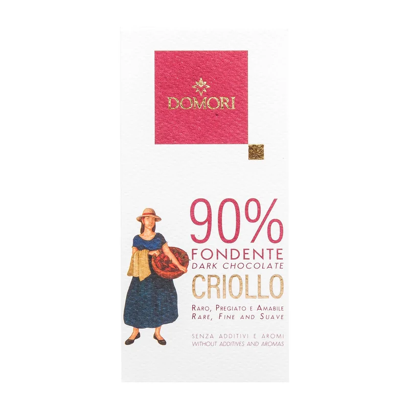 Domori Schokolade | Criollo 90% Die Domori Criollo 90% ist eine dunkle, intensiv aromatische Schokolade aus sehr seltenen Criollo Kakaobohnen mit einem Kakaoanteil von 90%. Die Bohnen für diese in Italien hergestellte, nur in limitierten Mengen verfügbare Schokoladentafel stammen von der Domori Plantage San José in Venezuela. Dort wird aus einem Blend aus den dort wachsenen Criollos die Grundlage für diese neue Schokoladen Tafel mit 50g gelegt. So schmeckt die Domori Criollo 90% Im Geschmack ist die Domori Criollo besonders fruchtig mit Noten von Karamell, Waldbeeren, Nüssen und Datteln, die durch den Rohrzucker, der hinzugefügt wird, um diese dunkle Schokolade mit 90% Kakaoanteil entstehen zu lassen, angenehm betontwerden. Die Criollo 90% wird ohne Zugabe von zusätzlicher Kakaobutter hergestellt. Criollo | feiner und aromatischer Kakao Die Criollo gilt als die edelste unter den Kakao Sorten. Die jährliche Ernte mit einer Reinheit von über 90% beträgt nur 0,001% der gesamten Kako Ernte weltweit. Mit dieser Sorte hat Domori, trotz der besonders schwierigen Ernte, der hohen Anfälligkeit für Krankheiten und der oftmals nur sehr geringen Erträge, die Welt der Schokolade revolutioniert.