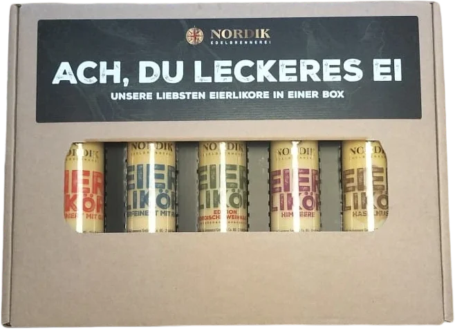 Alle Informationen zu Eierlikör Geschenkset In unserem Geschenkpäcken enthalten: Alle 5 Sorten als 100ml Flasche mit je 17% vol. Alkoholgehalt.1x Eier-Gin-Likör1x Eier-Haselnuss-Likör1x Eier-Himbeer-Likör1x Eier-Rum-Likör1x Eierlikör mit winterlichen GewürzenAnstelle puren Alkohols verwenden wir nur Himbeergeist, Rum, Haselnussgeist und Gin, um diese außergewöhnlichen Spezialitäten herzustellen. Das führt dazu, dass der Likör das typische Eierlikör-Aroma behält aber zusätzlich eine besonders fruchtige Note erhält. Ei küsst Himbeere, Rum, Haselnuss oder Gin. Frische Eier und edlem Himbeergeist, Rum, Haselnussgeist bzw. Gin verbinden sich zu traumhaft, leckeren Likören.Als Besonderheit enthält diese Geschenkbox unseren limitierten Eierlikör mit winterlichen Gewürzen.Einzigartige Likörbereitung: Ein Verfahren, das wir derzeit als Norddeutschlands einziger Hersteller anwenden.