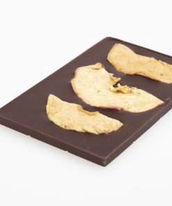 Dried Fuji apple dusted with Ceylon cinnamon adorns the creamy 56% oat chocolate made with organic cocoa from the Semuliki forest in Uganda.