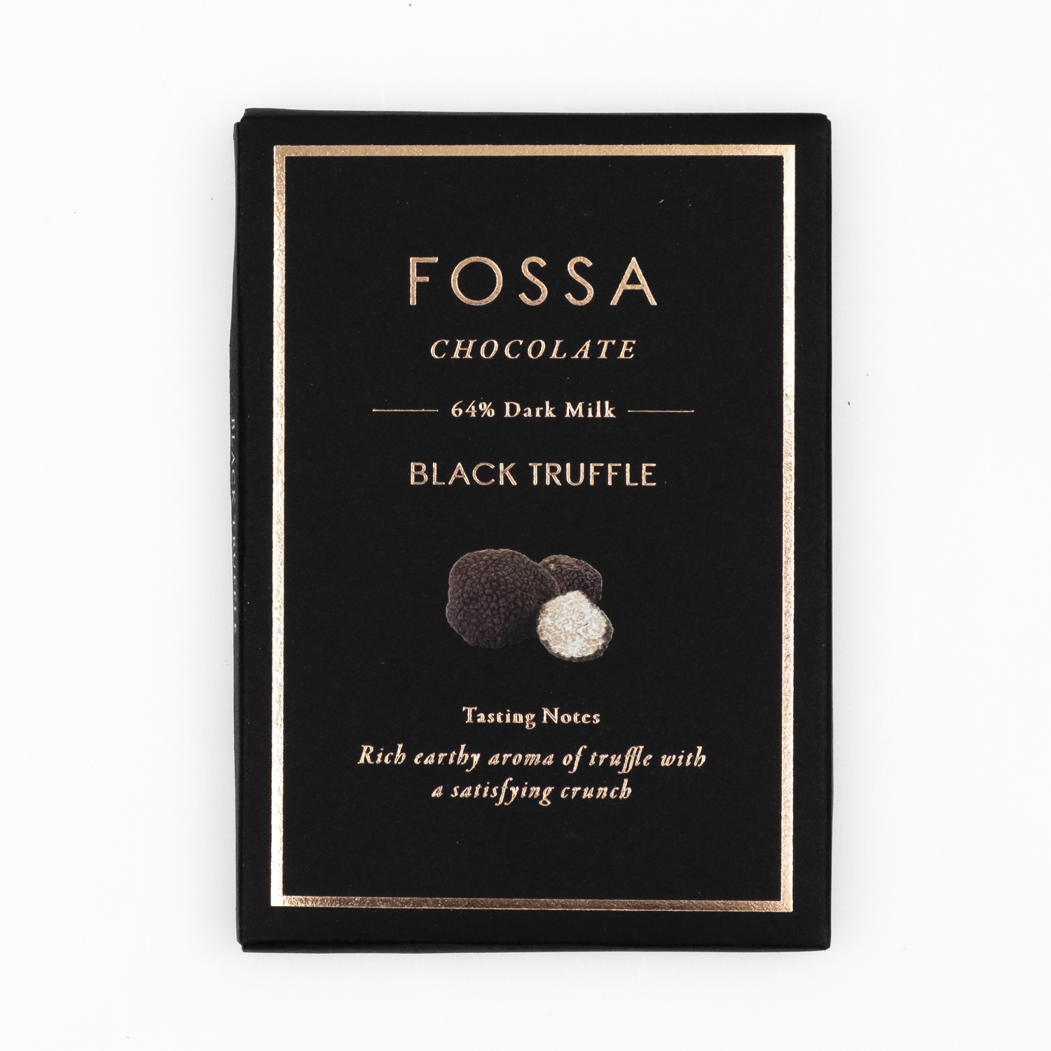 Dunkle Milchschokolade aus Kakaobohnen aus Casta Esmeralda, Ecuador aromatisiert mit schwarzen Trüffel.
